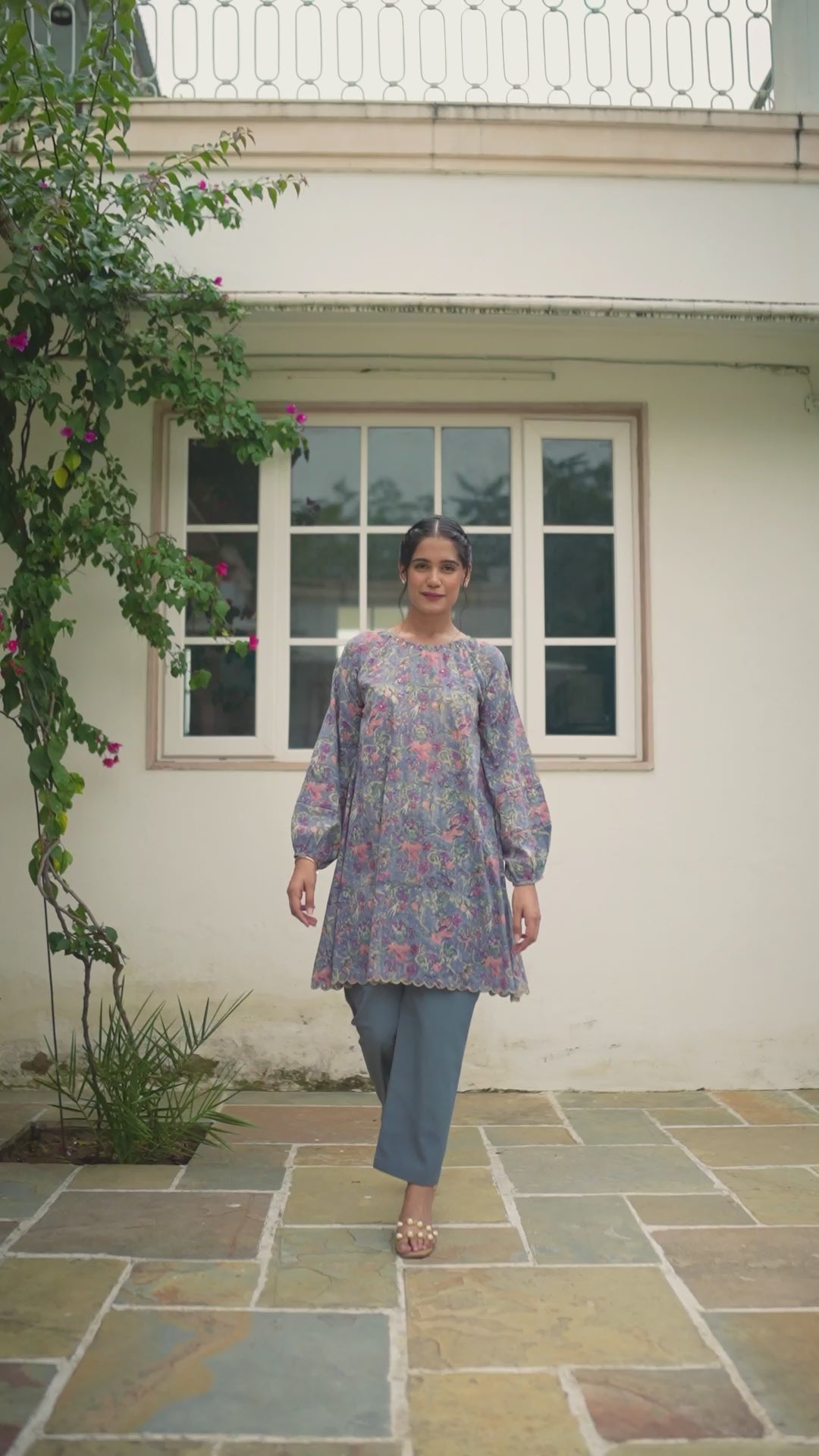 This elegant cotton mul block printed kurta set is a stunning piece with a timeless appeal. The intricate floral pattern, featuring vibrant hues of pink, blue, and green, is beautifully showcased on a soft, breathable fabric. The kurta features a comfortable round neckline and long sleeves, making it perfect for both casual and formal occasions.