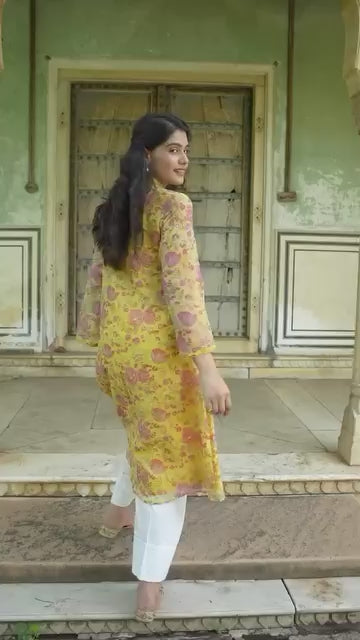 This Sunny Yellow Doriya Kurta features a chic a-line cut with 3/4th sleeves and a playful slit, showcasing a v-neck with potli detailing and a front panel adorned with tassel-tied Dori. It's paired with wide-leg cotton pants, adding a touch of flair with some stylish embellishments. Perfect for a breezy, casual day out!