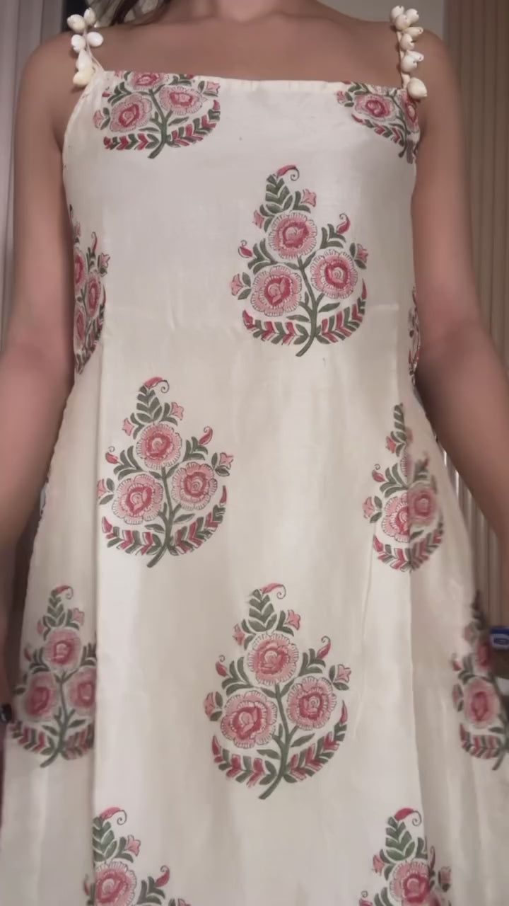 Embrace summer elegance in our sleeveless hand block printed Chandheri kurta, featuring a straight silhouette and contrast border print detailing at the side slits. Complete with adjustable straps adorned with shell embellishments for a touch of beachy charm. Pair effortlessly with our wide-leg solid cotton pant for a relaxed yet stylish ensemble perfect for any occasion.