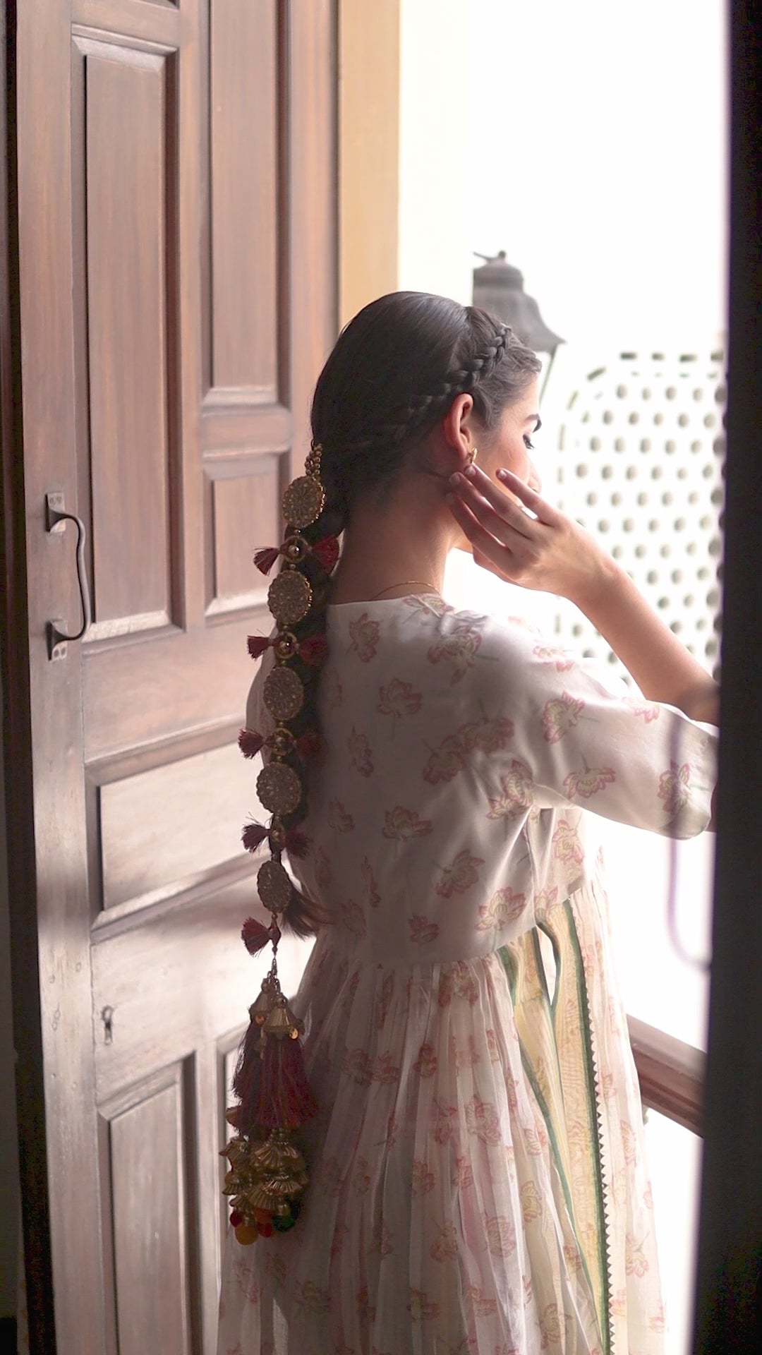 Timeless kurta with a cotton block print yoke & a muslin silk side-slit ghera to enhance the print, paired with straight printed pants adorned with lace detailing, makes a perfect choice for festive events!