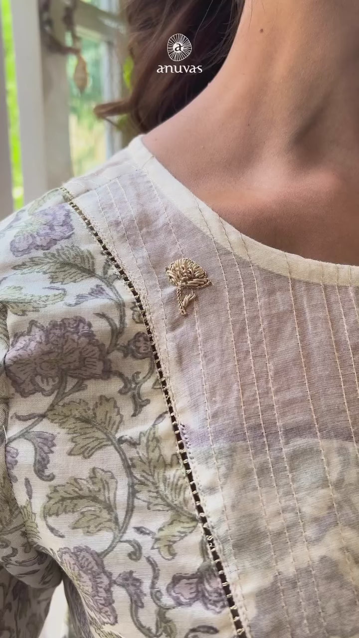 Exquisite hand block printed Chandheri straight kurta with delicate mul lining, offering both comfort and elegance. This classic piece features a round neck and a solid Chandheri yoke adorned with intricate hand embroidery on the front, adding a touch of sophistication. The back showcases a Chandheri yoke enriched with zari tagayi and loops, enhancing its allure. Pair this kurta with our cotton straight pants, beautifully accented with organza details at the hem, finished with meticulous handwork. Elevate your style with this timeless ensemble.